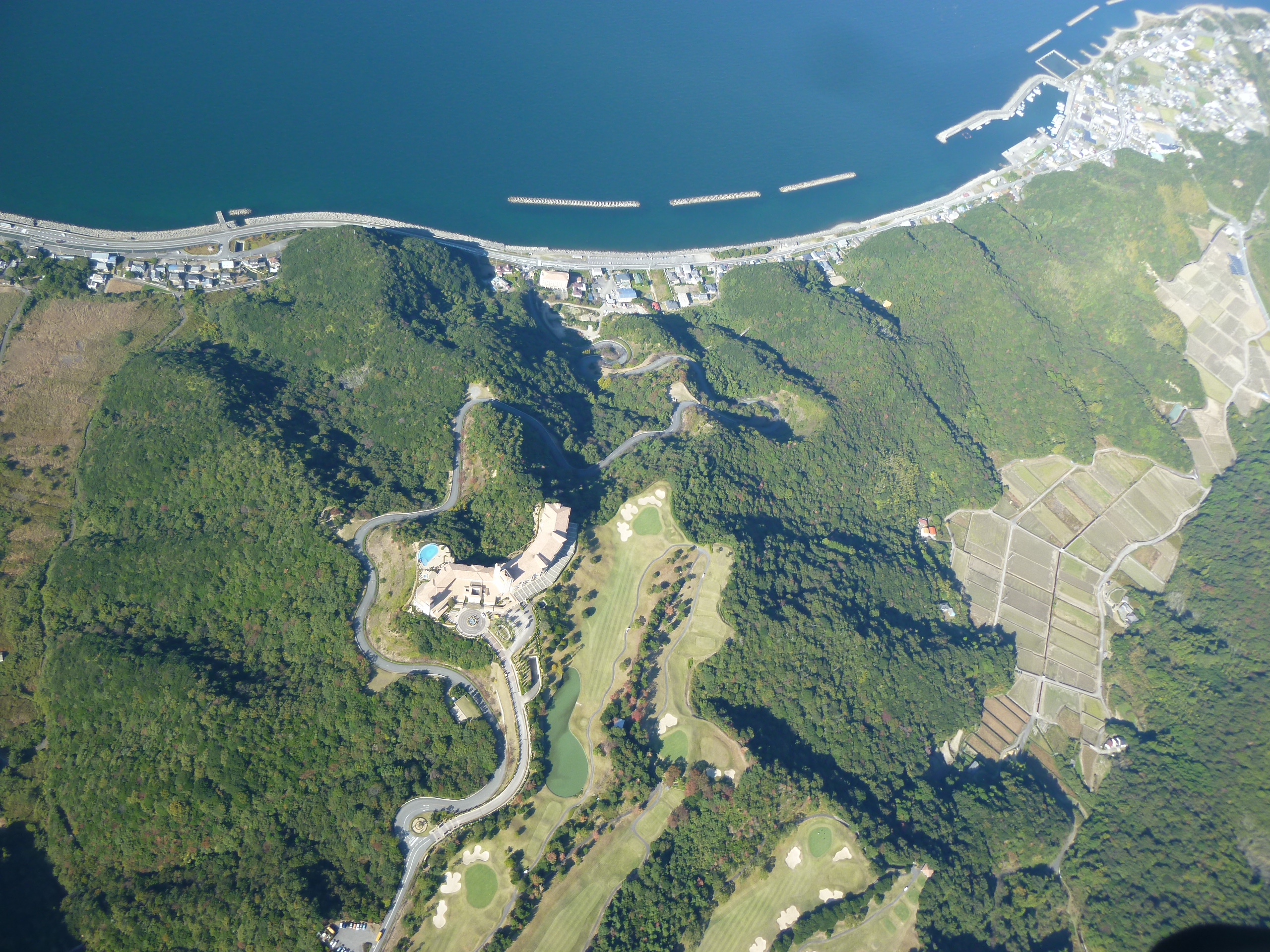 フライトエリアには北と南に山脈が走り、中央を東西に勝浦川が流れており、風光明媚なところです。広大なテイクオフのすぐ横には、これまた広大なフライト練習場があり、練習生には高高度フライトの前にそこで離着陸の練習ができます。